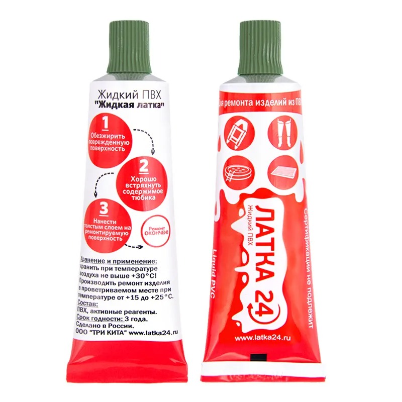 ЛАТКА24 для ремонта любых изделий из ПВХ. Теперь Вам не придется искать латку из похожего материала, чтобы заклеить поврежденные матрас или лодку. Достаточно нанести несколько капель на прокол или порез.