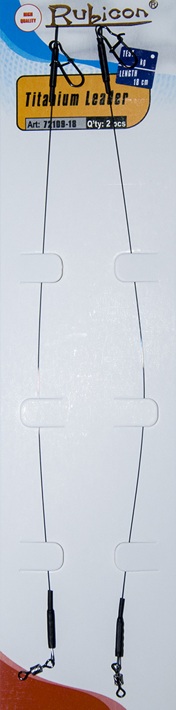 Титановый поводок с вертлюгом и двойной застежкой Quick Snap (американка). Обжимные трубки закрыты термоусадочным материалом. Титановые поводки используются преимущественно при ловле на спиннинг искусственными приманками на твич. При поклевке и вываживании рыбы поводок не деформируется. Не подвержен коррозии. При забросе приманки исключается перехлест приманки с леской или плетеным шнуром. Упакованы в пакет на подложке.