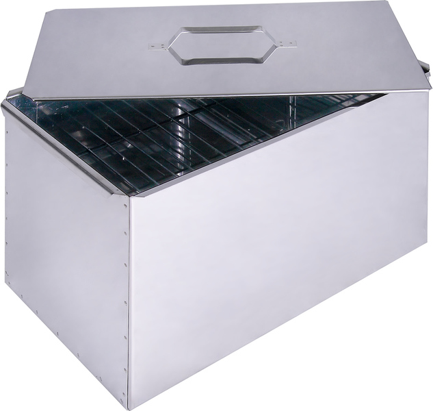 Главная особенность коптилен Инвент Групп — слайдерная крышка. Она не выгибается при нагревании, обеспечивает более полное копчение пищи, экономию щепы и времени.