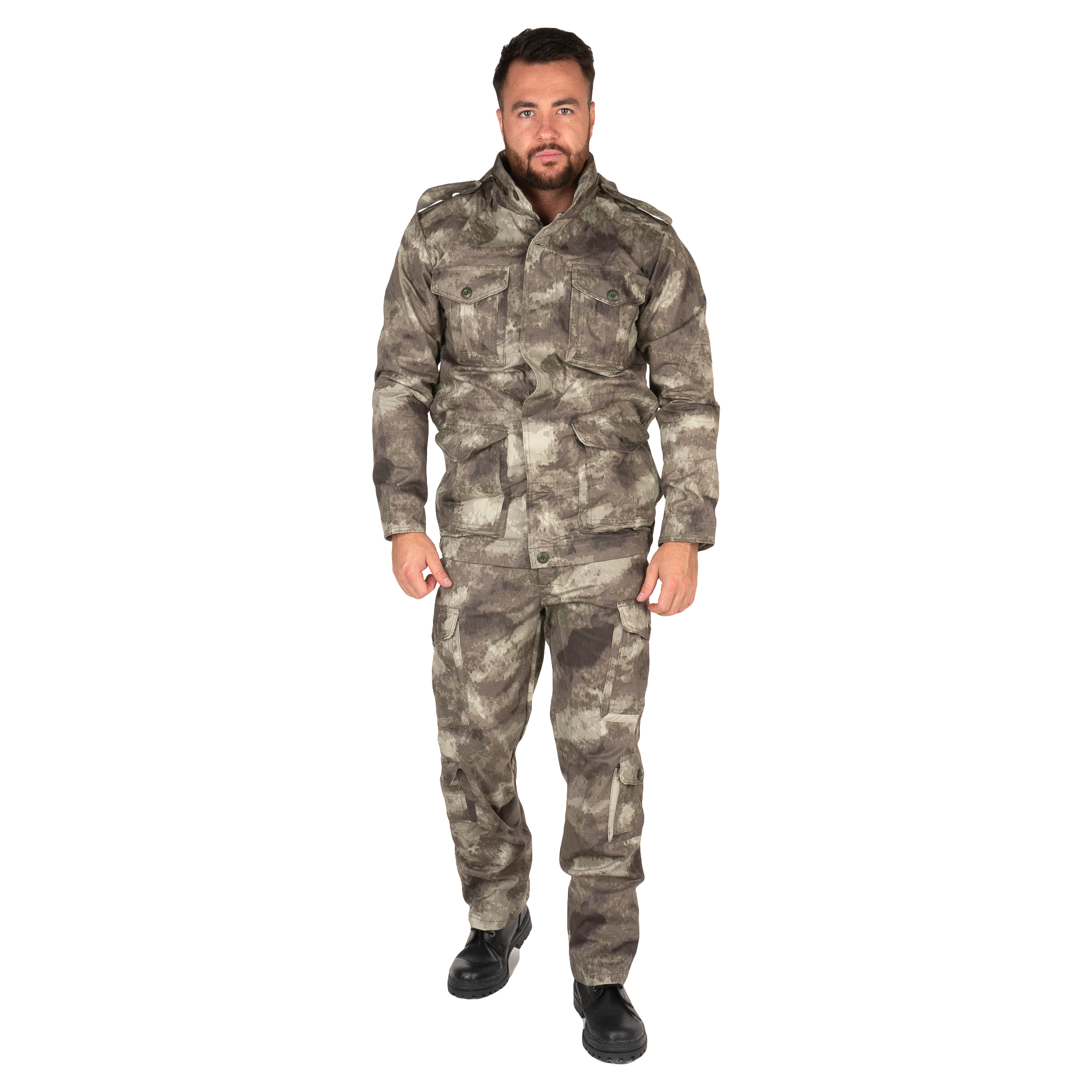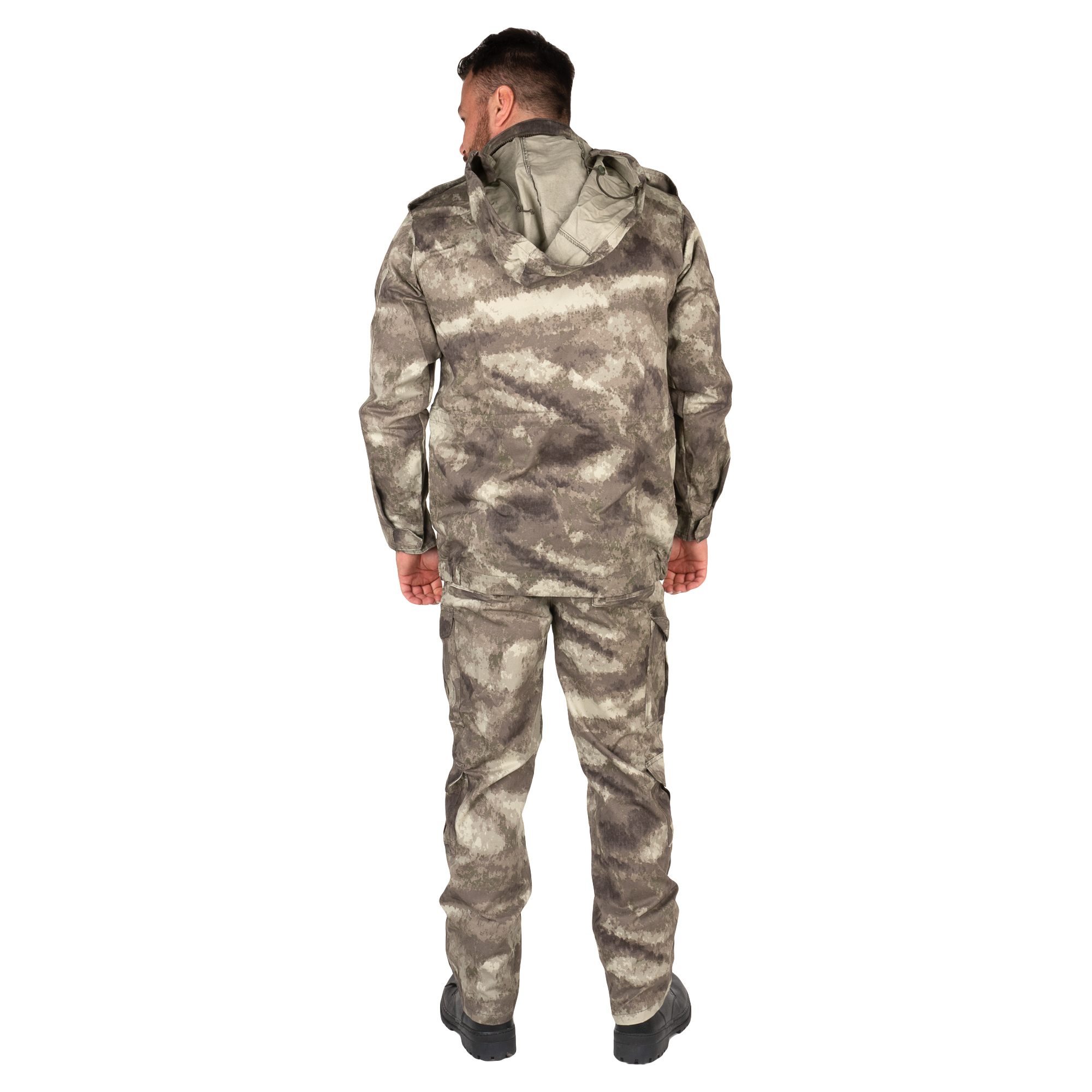 Аналог разработанного США костюма M-1965, он же всемирно известный M-65. Очень удобная куртка, с фирменным "стоячим" воротником, в который убирается капюшон. Брюки - хаки, на 8 карманов. Костюм сделан универсальным, с возможностью подгонки по ширине. Ткань - 100% хб, очень мягкая.