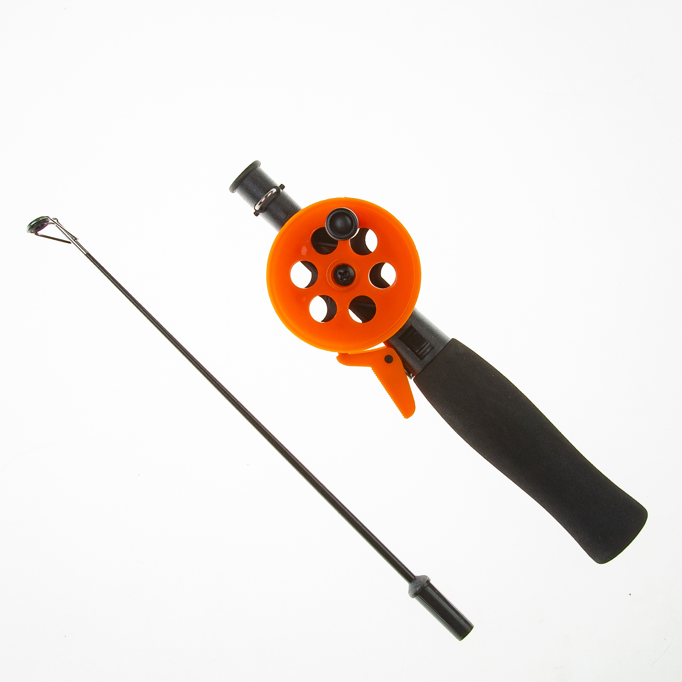Зимняя удочка RUBICON 50403 с открытой шпулей и съемным хлыстом с вклеенным тюльпаном. Штекерная, двухсоставная. Инерционная катушка со стопорным рычагом, при нажатии на который леска с приманкой легко сходят с катушки. Диаметр катушки 55 мм. Предназначена для ловли хищных рыб на вертикальные блесна и балансиры.