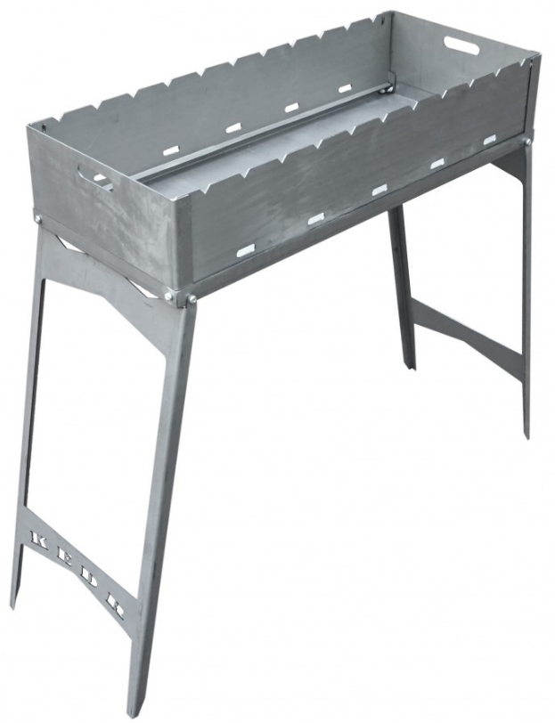 Данная конструкция позволяет в несколько движений разложить мангал, и при этом очень компактна. Высота мангала позволяет пользоваться им в полный рост, а длина позволяет одновременно разместить 11 шампуров.